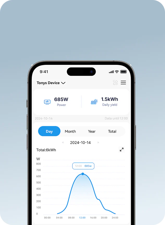 Über das Dashboard der App auf Ihrem Mobiltelefon können Sie die Stromerzeugung Ihrer Geräte jederzeit und überall überwachen.